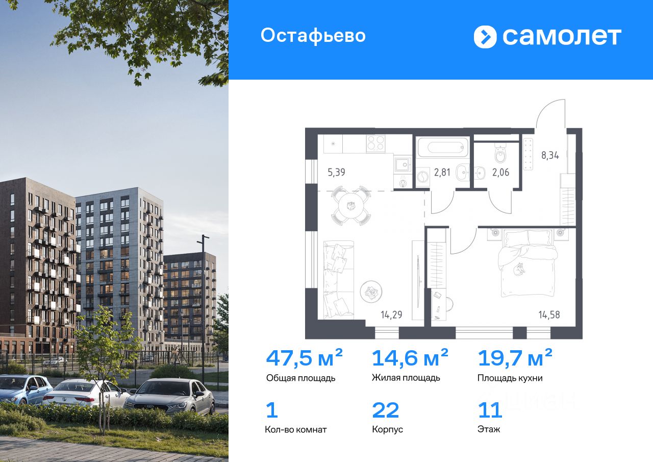 Строим кварталы для жизни с заботой о будущем. Предлагается 1-комнатная квартира комфорт-класса 47,47 кв.м в корпусе 22 на 11 этаже, в ЖК "Остафьево"