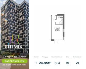 Продаётся студия в строящемся доме (Корпус 4), срок сдачи: III-кв. 2026, общей площадью 20.95 кв.м., на 15 этаже.