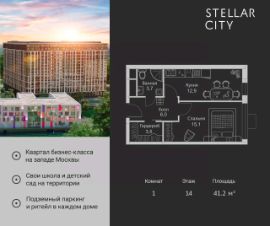 Квартира находится на 14 этаже, 4 корпуса жилого квартала Stellar City — микрогорода будущего на орбите Москвы.
