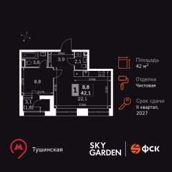 Продаётся 1-к квартира номер 85 общей площадью 42.1 кв.м. на 12-м этаже 29 этажного здания. Чистовая отделка. Цена с учётом скидки.
