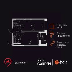 Продаётся 1-к квартира номер 369 общей площадью 44.4 кв.м. на 6-м этаже 26 этажного здания. Отделка Whitebox. Цена с учётом скидки.