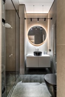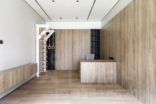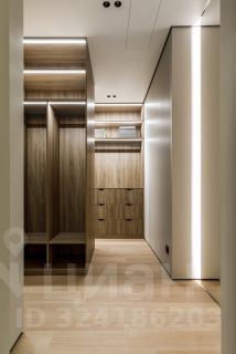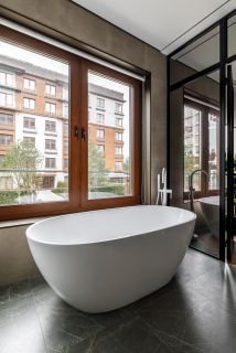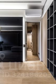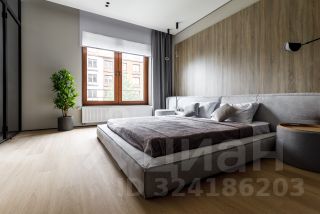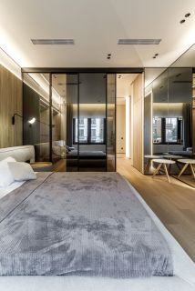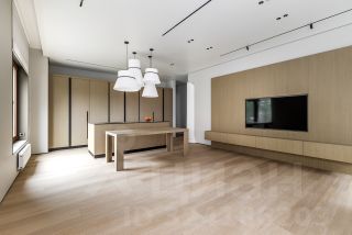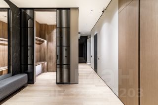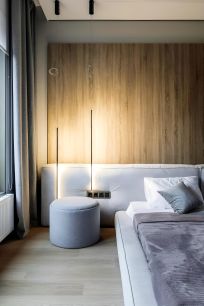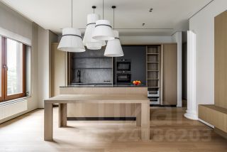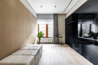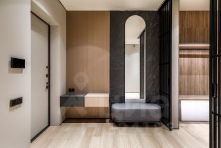 Дизайнерский интерьер выполнен в благородной палитре с акцентами из натурального дерева.