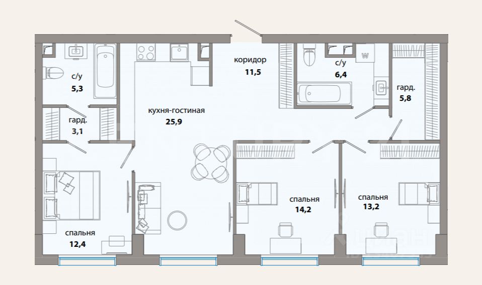 Просторные кухня-гостиная и 2 отдельные гардеробные.