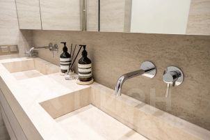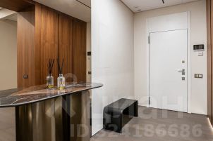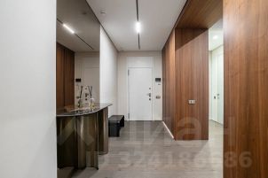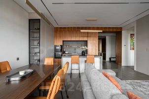 В отделке использованы дорогие, качественные и современные материалы: кухня и стеновые панели в коридоре выполнены из шпона ореха, на полу инженерная доска Finex, раковины в санузлах, остров и фартук на кухне - из керамогранита, сенсорные панели слива и инсталляция ТЕСЕ в санузлах, разноплановые световые решения.