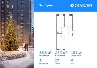 Строим кварталы для жизни с заботой о будущем. Предлагается 2-комнатная квартира комфорт-класса 63,79 кв.м в корпусе 13 на 8 этаже, в ЖК "Эко Бунино"