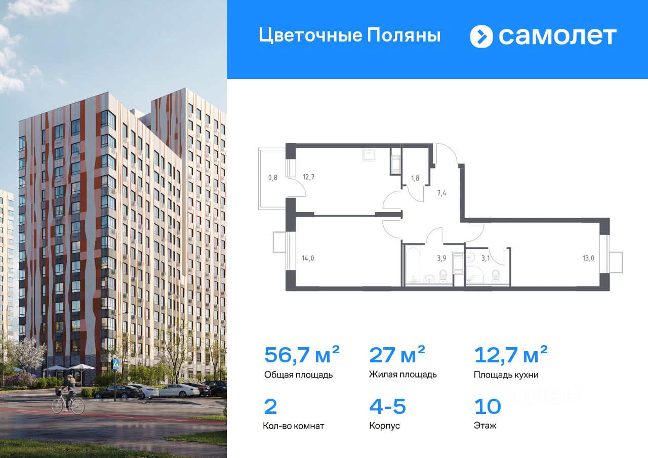 Строим кварталы для жизни с заботой о будущем. Предлагается 2-комнатная квартира комфорт-класса 56,7 кв.м в корпусе 4-5 на 10 этаже, в ЖК "Цветочные Поляны"