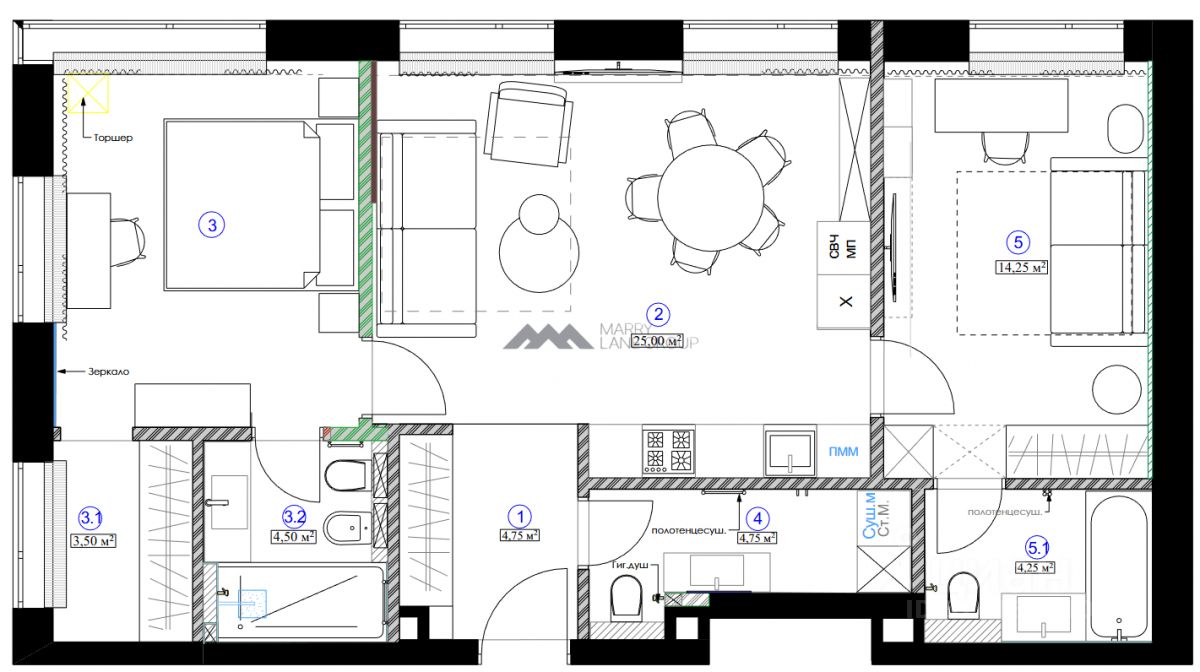 Эффективная, эргономичная планировка и дизайн проект от архитектурного бюро Architeque Design Bureau, 2 мастер спальни с собственными санузлами и гардеробными), кухня-гостиная, гостевой санузел с постирочной.