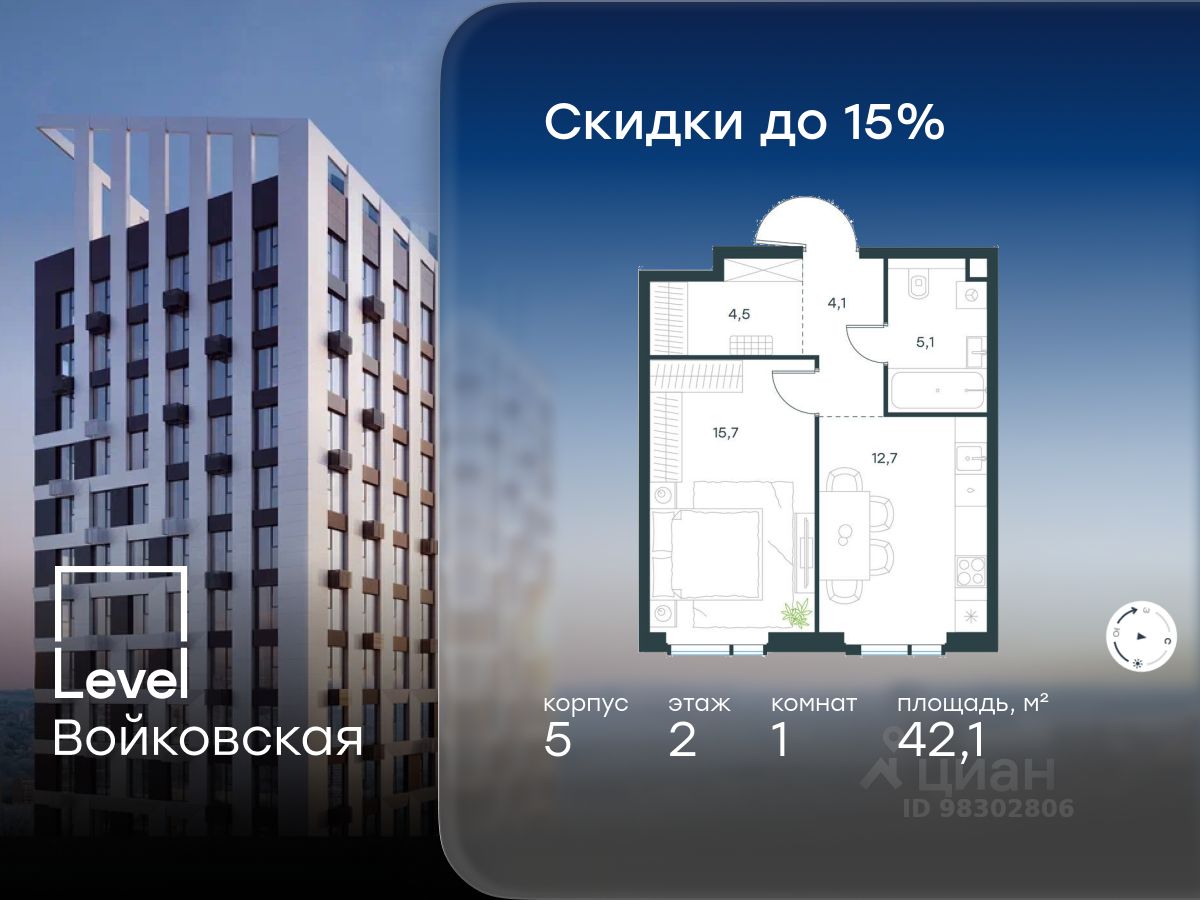 Продается 1-комнатная квартира площадью 42.10 кв. м без отделки. Квартира находится на 2 этаже 20-этажного корпуса 5, в новом жилом комплексе бизнес-класса Level Войковская, расположенном рядом с живописным заповедником "Покровское-Стрешнево" (застройщик - компания Level Group/Левел групп).
