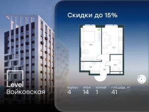 Продается 1-комнатная квартира площадью 41.00 кв. м с отделкой. Квартира находится на 14 этаже 26-этажного корпуса 4, в новом жилом комплексе бизнес-класса Level Войковская, расположенном рядом с живописным заповедником "Покровское-Стрешнево" (застройщик - компания Level Group/Левел групп).