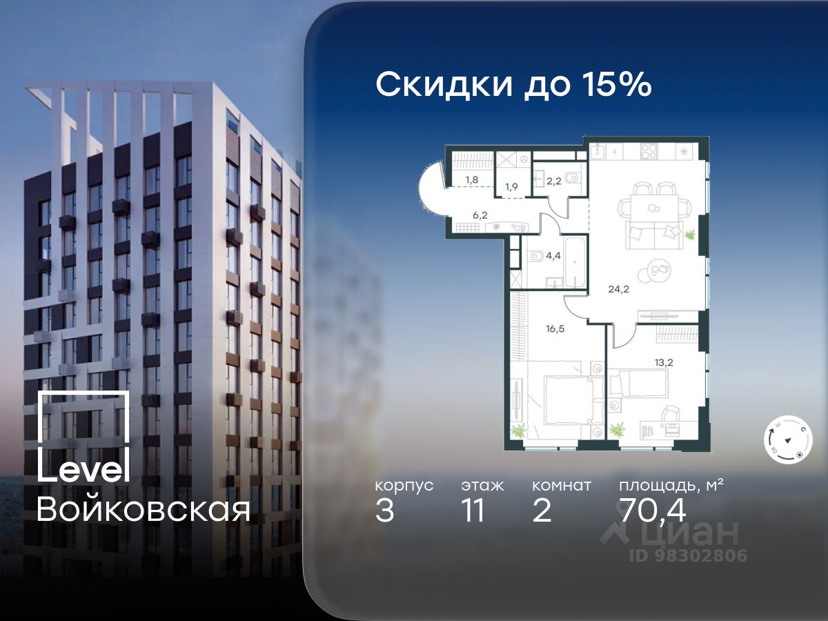 Продается 2-комнатная квартира площадью 70.40 кв. м без отделки. Квартира находится на 11 этаже 20-этажного корпуса 3, в новом жилом комплексе бизнес-класса Level Войковская, расположенном рядом с живописным заповедником "Покровское-Стрешнево" (застройщик - компания Level Group/Левел групп).