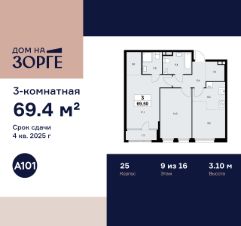 Продается трехкомнатная квартира 249 в новостройке ЖК "Дом на Зорге" по адресу Москва, САО, Сокол, улица Зорге, 25с2, Москва, 125252. Общая площадь квартиры - 69.40 кв. м., этаж 9 из 16, секция 2. Тип проекта, по которому построен дом - монолит, компания-застройщик - ООО "А101". Стоимость квартиры - 38061504 Р. Срок сдачи - 4 квартал 2025.