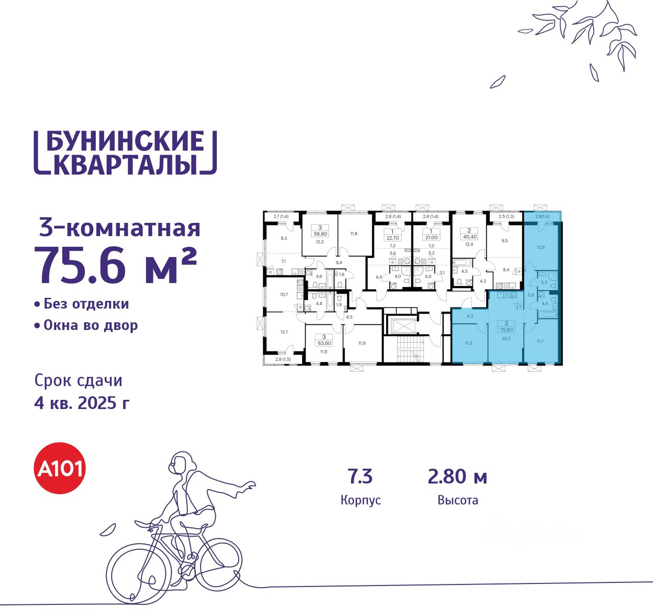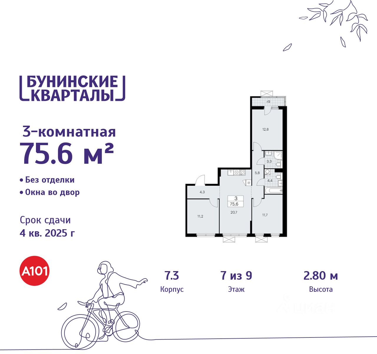 Продается трехкомнатная квартира 648 в новостройке ЖК "Бунинские кварталы" по адресу Москва, ТиНАО, Новомосковский АО, Сосенское С/П, жилой комплекс Бунинские Кварталы, 7.3, район Коммунарка, Новомосковский административный округ, Москва. Общая площадь квартиры - 75.60 кв. м., этаж 7 из 9, секция 9. Тип проекта, по которому построен дом - монолит, компания-застройщик - ООО "А101". Стоимость квартиры - 21967848 Р. Срок сдачи - 4 квартал 2025.