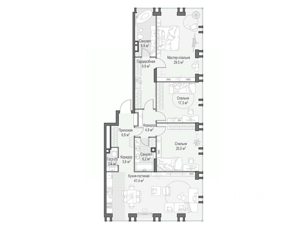 Просторная квартира площадью 151,6 кв. м. Из кухни-гостиной (41,4 кв. м) открывается панорамный вид на красивый двор-парк с ландшафтным дизайном и вечерней подсветкой. Окна спален направлены в сторону Останкинской башни и исторического центра Москвы. Продуманная планировка позволяет разместить три приватные спальни, в одной из которых, примыкающей к мастер-спальне, предусмотрен санузел с окном, что делает ваше личное пространство по-настоящему комфортным. Окна выходят на три стороны.