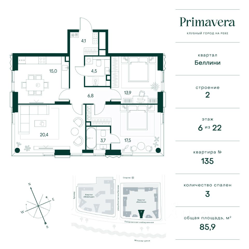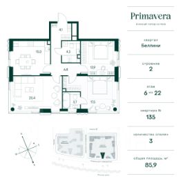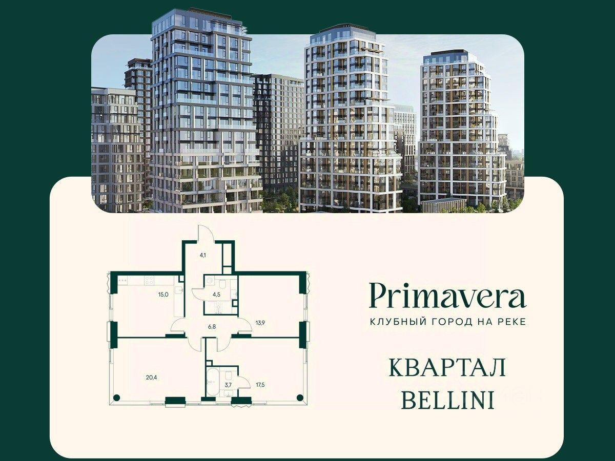 Клубный город на реке Primavera — это современный жилой комплекс премиум-класса, расположенный на первой береговой линии Москвы-реки в экологически чистом районе Покровское-Стрешнево. Под панорамными окнами квартир находится собственный экопарк с продуманной сетью прогулочных дорожек и современными детскими и спортивными площадками. За парком расположена набережная с собственным пляжем и зонами для отдыха. Клубный город на реке Primavera предлагает широкий выбор планировок для различных жизненных сценариев: от просторных однокомнатных квартир до пентхаусов и жилых помещений с террасами и патио. Выберите из 120 вариантов эргономичных планировок стандартного и евроформата. Из каждой квартиры открываются красивые виды на реку с углом обзора в 270 градусов. Дизайнерские лобби предлагают панорамный обзор на благоустроенный двор. Высокие потолки в 6 метров и качественная отделка создают атмосферу, схожую с пятизвездочными отелями. В Primavera есть всё необходимое для комфортной жизни в мегаполисе: • Образование для детей в шаговой доступности: 4 школы, 8 детских садов и развивающие центры с кружками и секциями. • Удобства на расстоянии приятной прогулки: супермаркеты, кафе, рестораны с верандами, салоны красоты, аптеки и многофункциональный центр для шоппинга и развлечений. • Умный дом: автоматизированное бесконтактное управление основными системами доступа и безопасности через мобильное приложение. Клубный город на реке Primavera выгодно сочетает комфорт городской жизни с близостью к природе. Живите в месте, где все создано для вашего удобства!