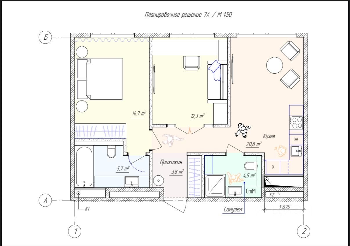 Планировка позволяет создать уютное и функциональное пространство для всей семьи. В квартире 2 стояка, в будущем у вас будет возможность спроектировать 2 санузла.