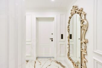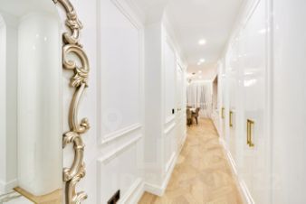 Пол — модульный паркет из дуба в стиле "дворцовая плетенка", в мокрых зонах и прихожей — итальянский керамогранит с подогревом