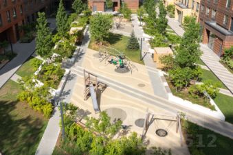 Корпуса с дворами-парками, без автомобилей, с видеонаблюдением. Спорт., игровые и дет. площадки с безопасным покрытием. Помещения для колясок/велосипедов/самокатов в холлах