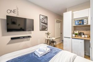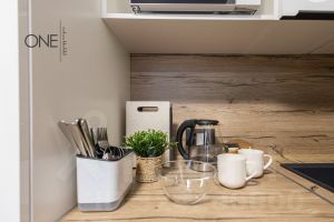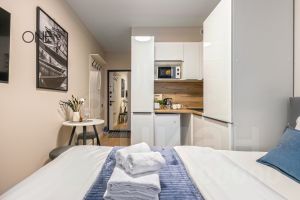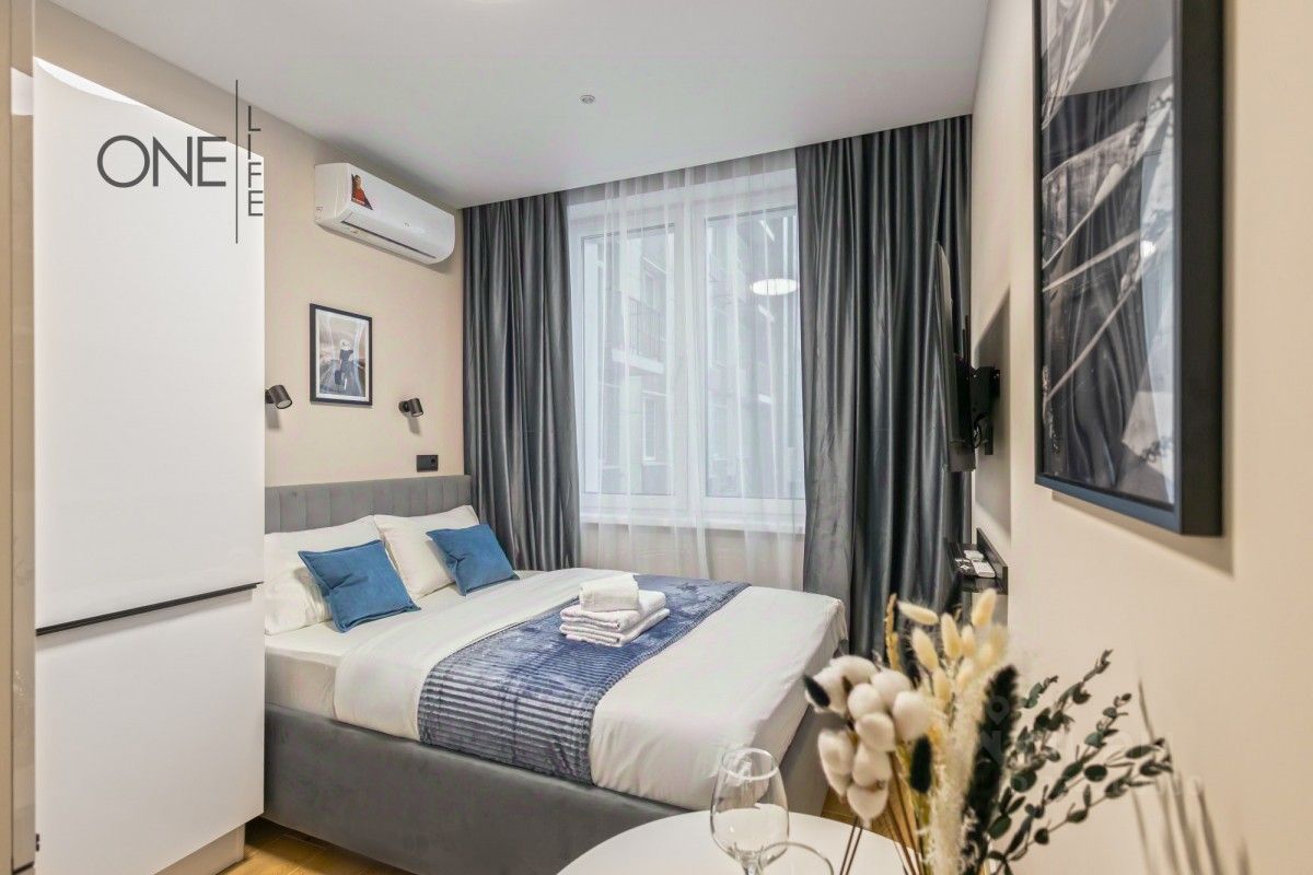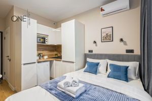 Внутреннее пространство апартаментов выполнено в современном дизайнерском стиле. Все предметы мебели тщательно подобраны и гармонично дополняют общую атмосферу. Санузел совмещенный и оборудован необходимой сантехникой для вашего комфорта.