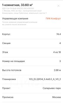 1-комнатная квартира с предчистовой отделкой в ЖК Саларьево Парк, корпус 74.4, строительство идёт, заселение до апреля 2028г.