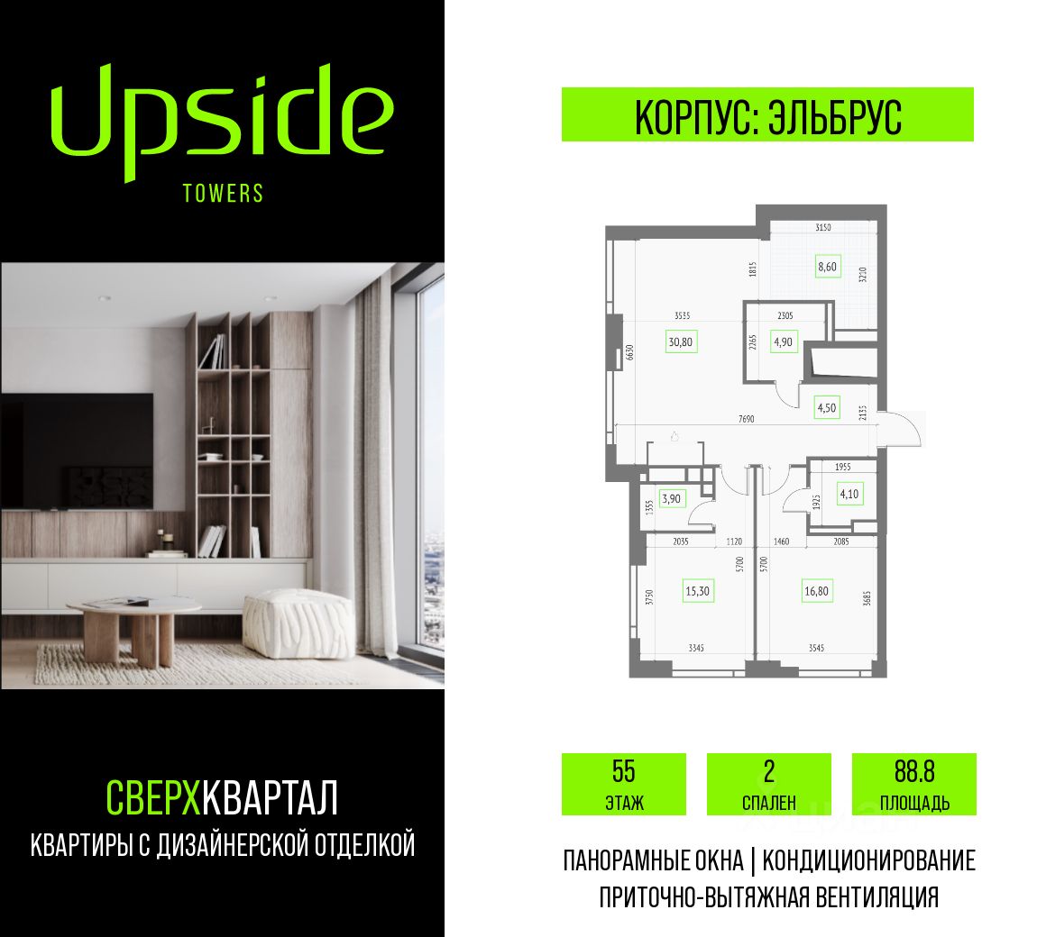 Продаётся 2-комнатная квартира площадью 88.8 кв.м на 55 этаже 55 этажного корпуса Эльбрус в квартале небоскребов "Upside Towers". c видом на прогулочный бульвар, 2 очередь, центр, Москва Сити, Савеловский Сити. Номер квартиры А5501.