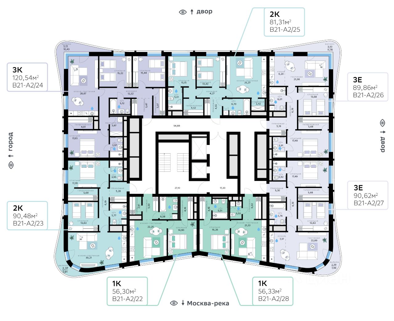 В продаже — двухкомнатная квартира, общей площадью 89,86 кв. м. Квартира расположена на пятом этаже тринадцатиэтажной секции корпуса класса Адвансд в новом районе СберСити, который строит Сбер. Дом находится на второй береговой линии Москвы-реки.