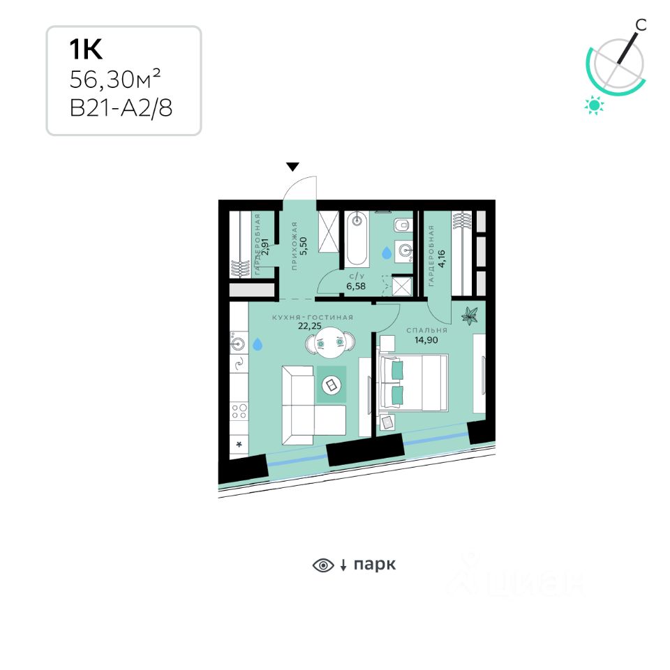 В продаже — однокомнатная квартира, общей площадью 56,3 кв. м. Квартира расположена на третьем этаже тринадцатиэтажной секции корпуса класса Адвансд в новом районе СберСити, который строит Сбер. Дом находится на второй береговой линии Москвы-реки.