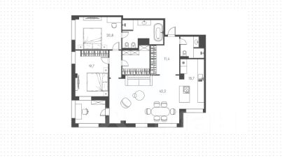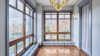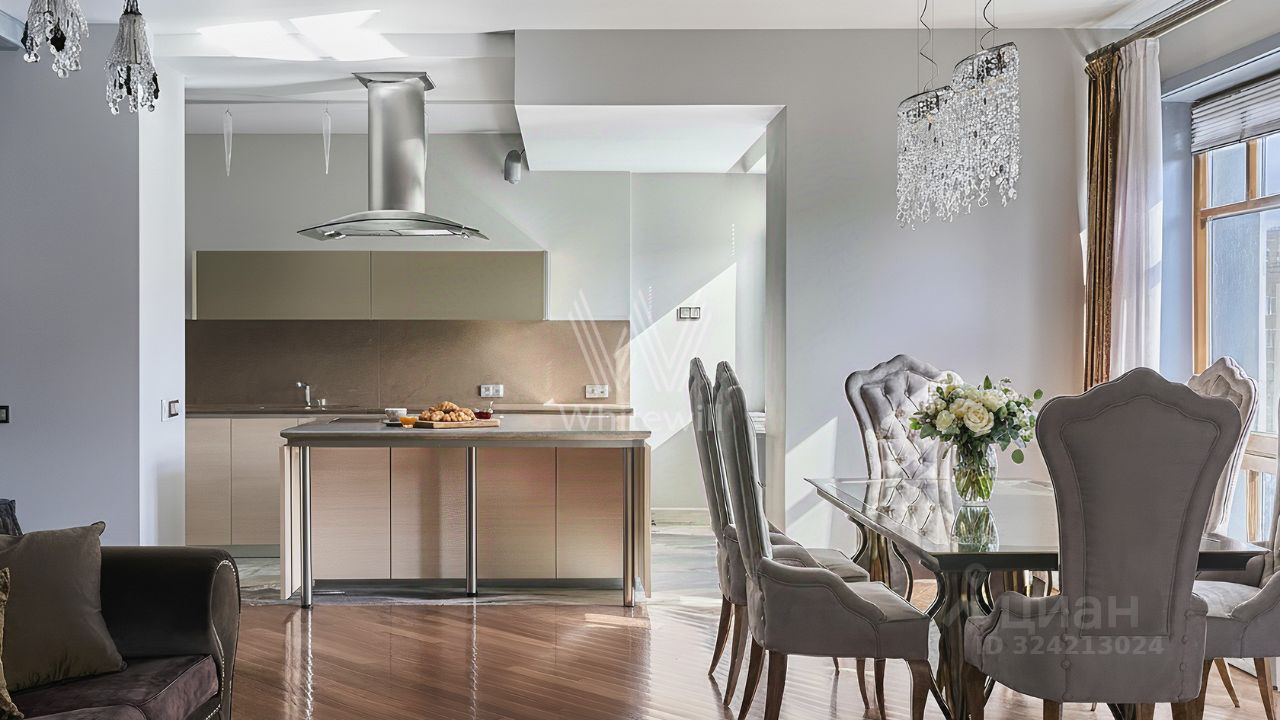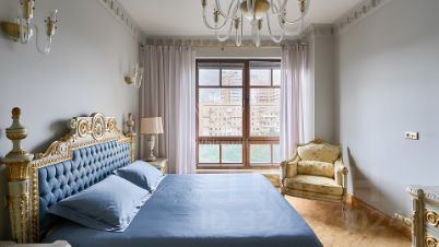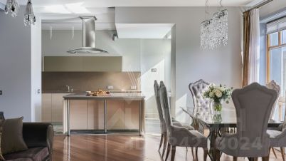 Планировка включает кухню-гостиную с обеденной зоной, две спальни, кабинет либо третью спальню, два санузла и вместительную гардеробную. Квартира укомплектована итальянской мебелью и техникой Miele. Установлена система центрального кондиционирования.