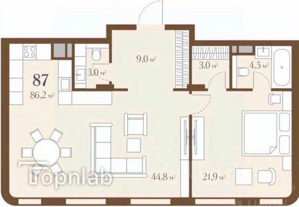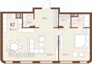 В двухкомнатной квартире 5 распашных окон в пол, много света всегда, даже в пасмурную московскую погоду. Из них открывается чудесный вид на тихий зелёный двор. Просторная кухня-гостиная 44 м² , ее можно разделить на 3 зоны: кухня, столовая и зона отдыха, приема гостей. Спальня с собственной гардеробной и ванной комнатой. В холле гостевой санузел и много места для хранения. Предусмотрена приточно-вытяжная вентиляция. Квартира предлагается без отделки, чтобы вы могли реализовать собственные мечты.