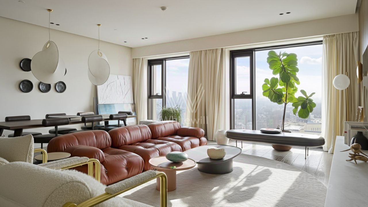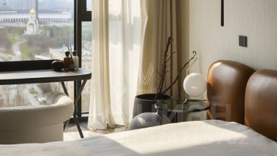 Функциональная планировка включает просторную кухню-гостиную с обеденной зоной, мастер-спальню с собственной гардеробной и ванной, вторую спальню, два санузла и холл. Благодаря панорамному остеклению пространство наполнено светом и теплом, открываются виды на парк Победы.