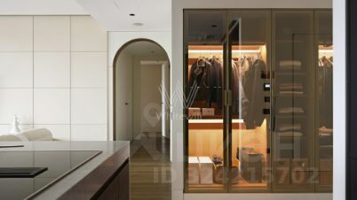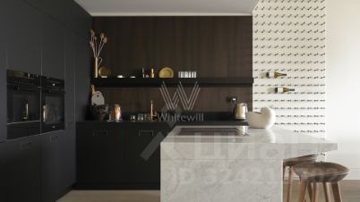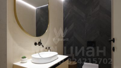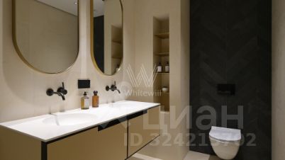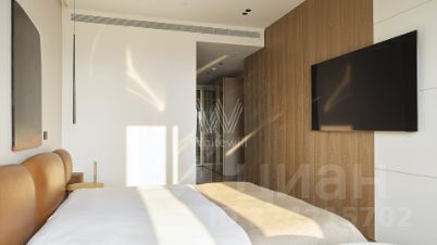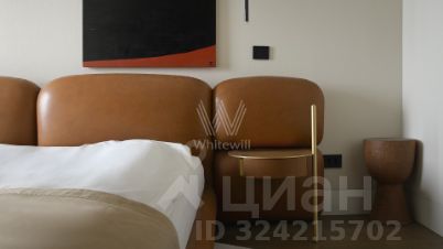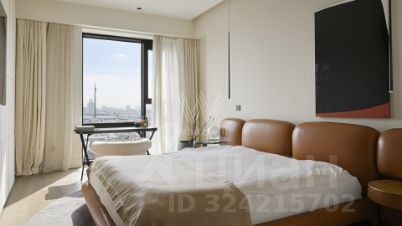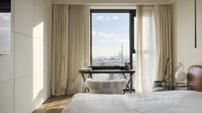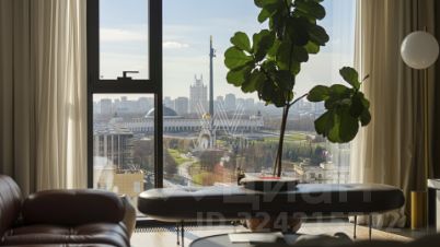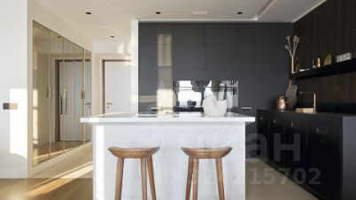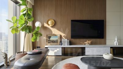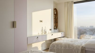 Апартаменты с двумя спальнями общей площадью 128 м² в комплексе премиум-класса "Поклонная, 9" на восемнадцатом этаже. Интерьер оформлен в современном стиле по авторскому дизайн-проекту, на полу выложены паркетная доска и плитка. Основной акцент создают панели из дерева и золотистые вставки. Просторные комнаты полностью укомплектованы мебелью и бытовой техникой.
