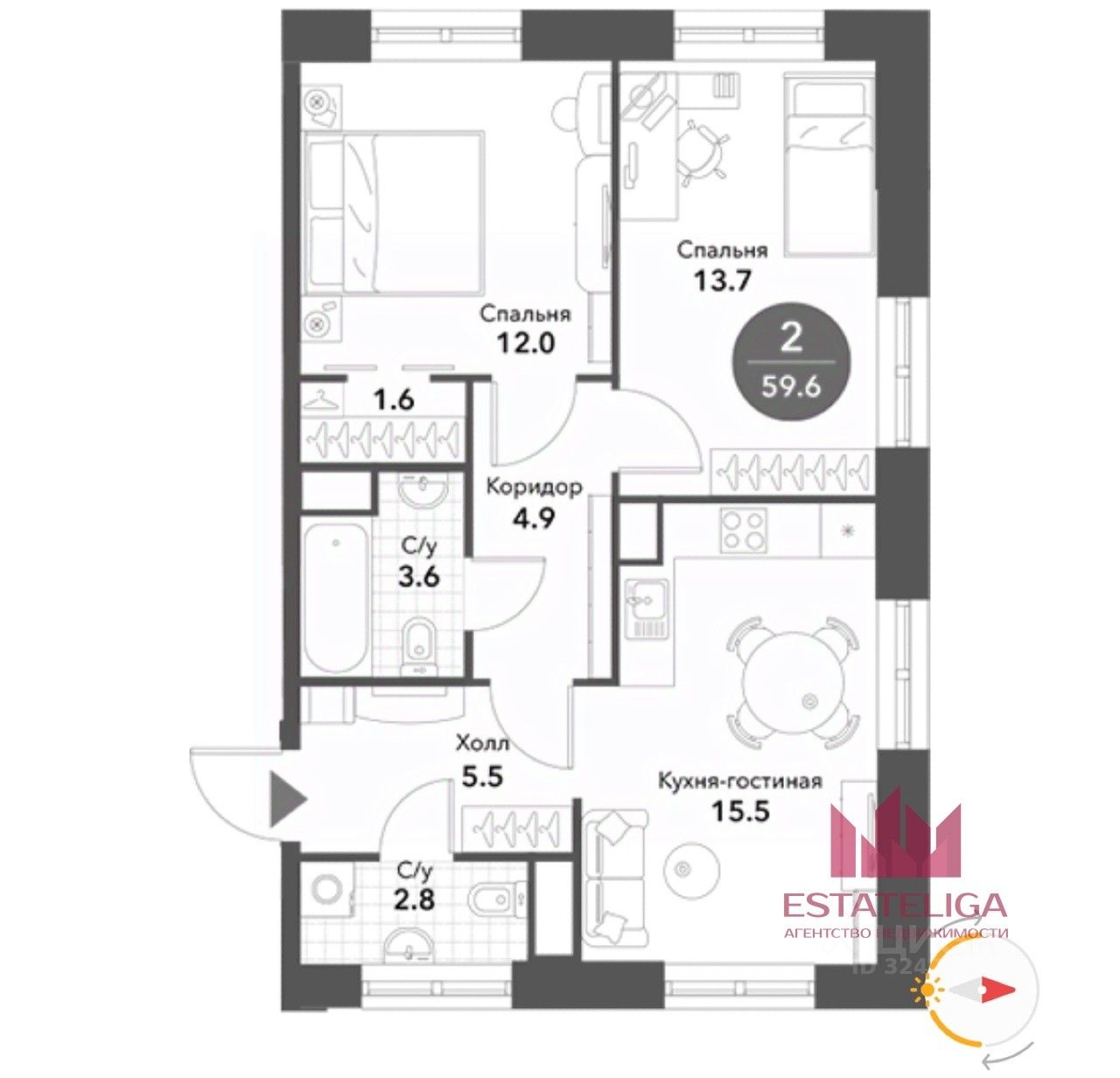 Продаются апартаменты с двумя спальнями общей площадью 59,6 кв.м. в комплексе бизнес-класса Voxhall.