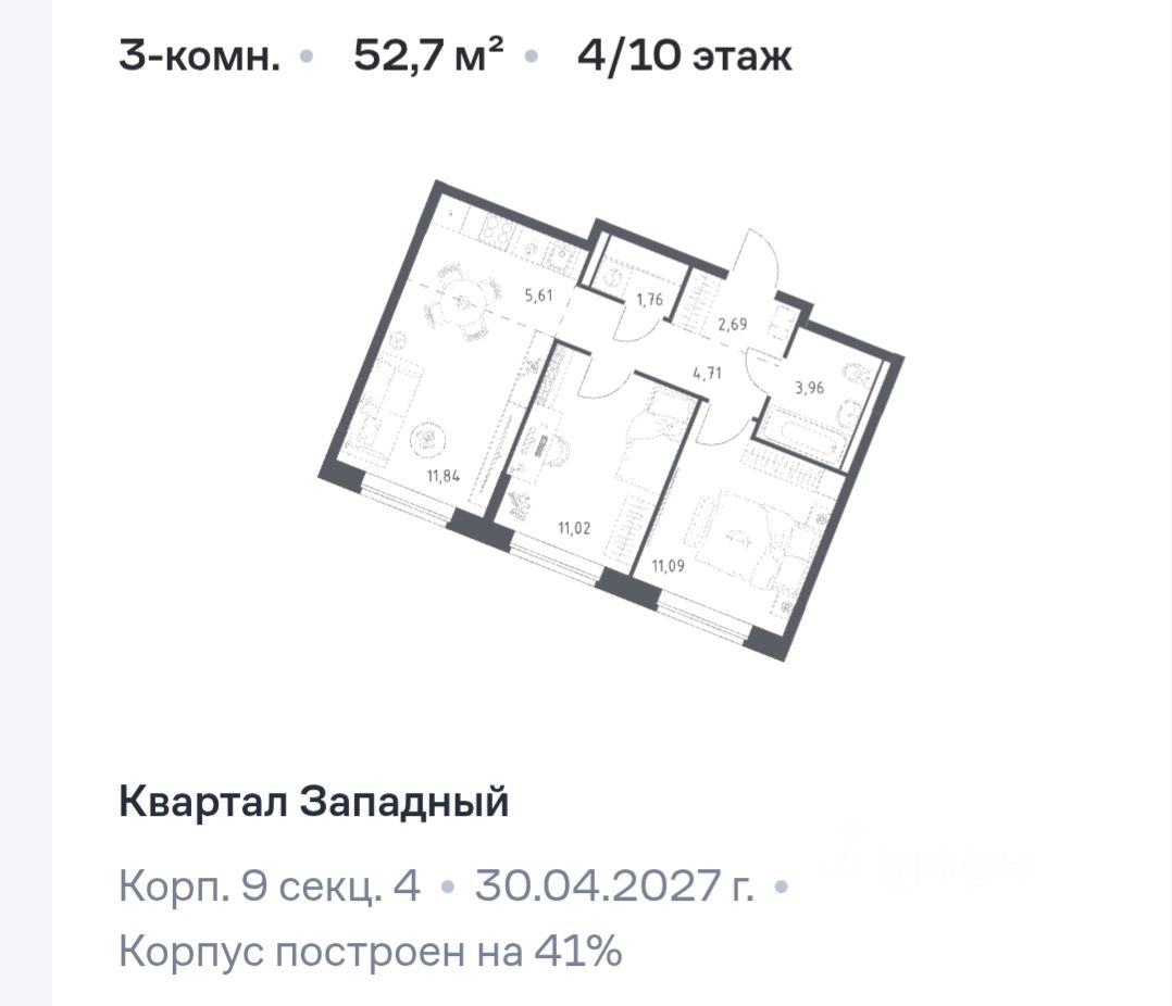 Евротрешка в новом ЖК "Квартал западный" 52.7 кв.м.