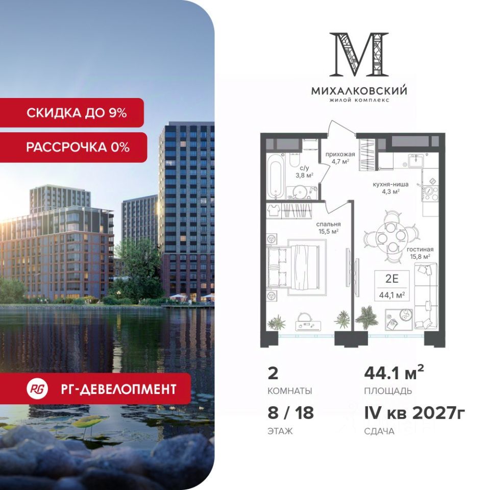 Продаётся 2-к квартира 44,1 кв.м. в ЖК "Михалковский" на 8-м этаже 18 этажного дома.