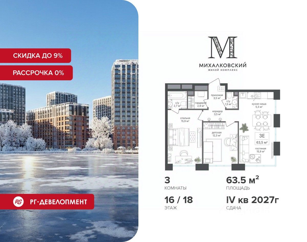 Продаётся 3-к квартира 63,5 кв.м. в ЖК "Михалковский" на 16-м этаже 18 этажного дома.