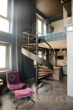Элегантная круговая лестница ведет на второй этаж, где расположена спальня, практичная гардеробная и современная душевая.