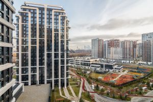 Окна выходят не на дорогу. Открытый вид во двор на ландшафтный дизайн и на Москва-Сити.