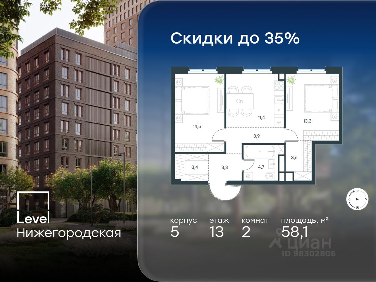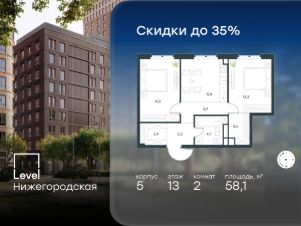 В активно развивающемся районе на юго-востоке столицы продается 2-комнатная квартира площадью 58,1 кв.м с отделкой "white box".. Квартира расположена на 13 этаже 29-этажного этажного корпуса 5 в жилом комплексе комфорт-класса Level Нижегородская (компания Level Group/Левел групп).