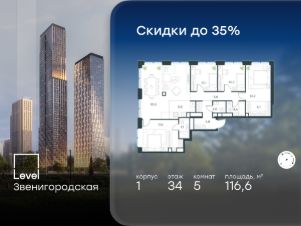 В жилом квартале продаётся многокомнатная квартира площадью 116.60 кв.м white box. Квартира расположена на 34 этаже 48 этажного корпуса 1 в жилом комплексе комфорт класса Level Звенигородская (компания Level Group/Левел групп).