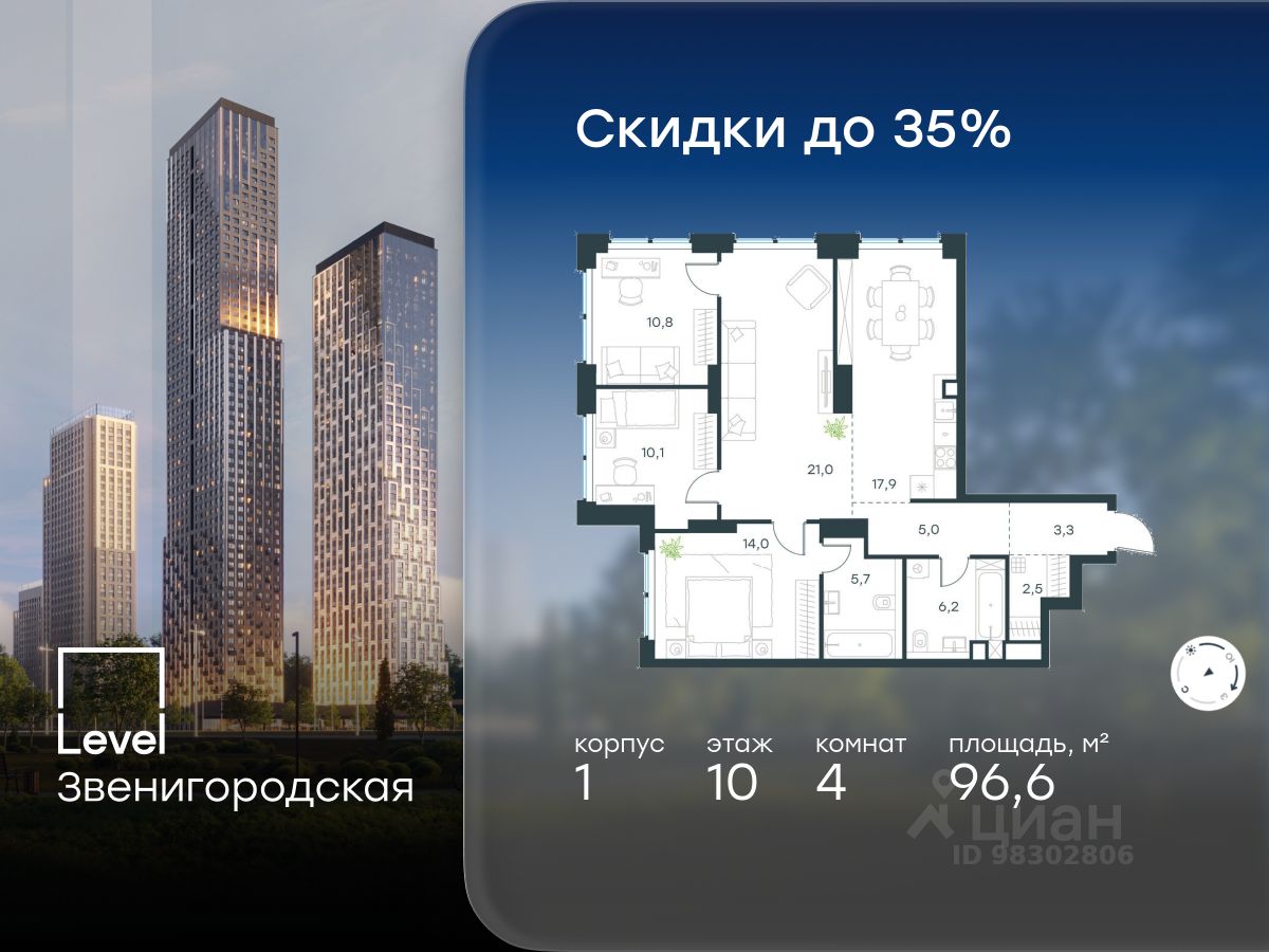 В жилом квартале продаётся 4-комнатная квартира площадью 96.60 кв.м white box. Квартира расположена на 10 этаже 48 этажного корпуса 1 в жилом комплексе комфорт класса Level Звенигородская (компания Level Group/Левел групп).