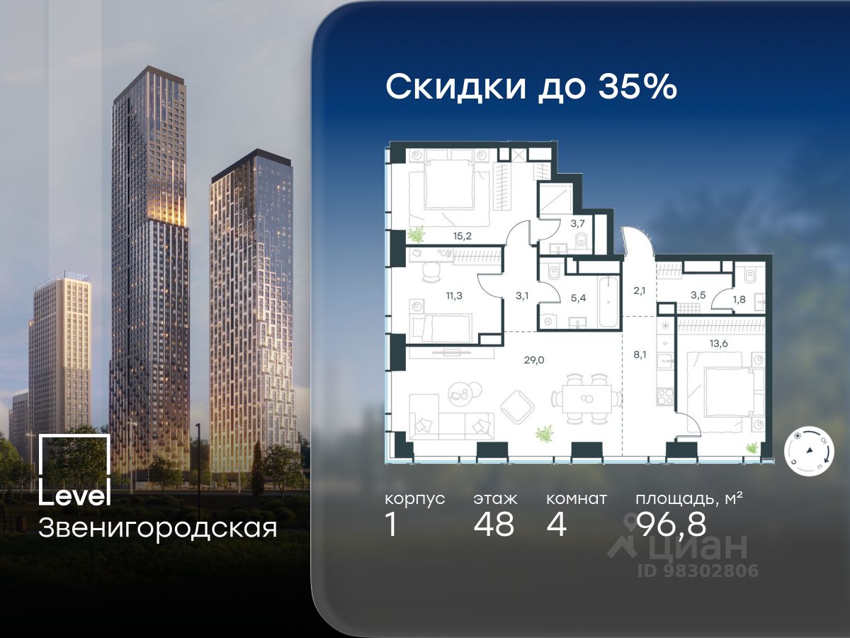 В жилом квартале продаётся 4-комнатная квартира площадью 96.80 кв.м white box. Квартира расположена на 48 этаже 48 этажного корпуса 1 в жилом комплексе комфорт класса Level Звенигородская (компания Level Group/Левел групп).