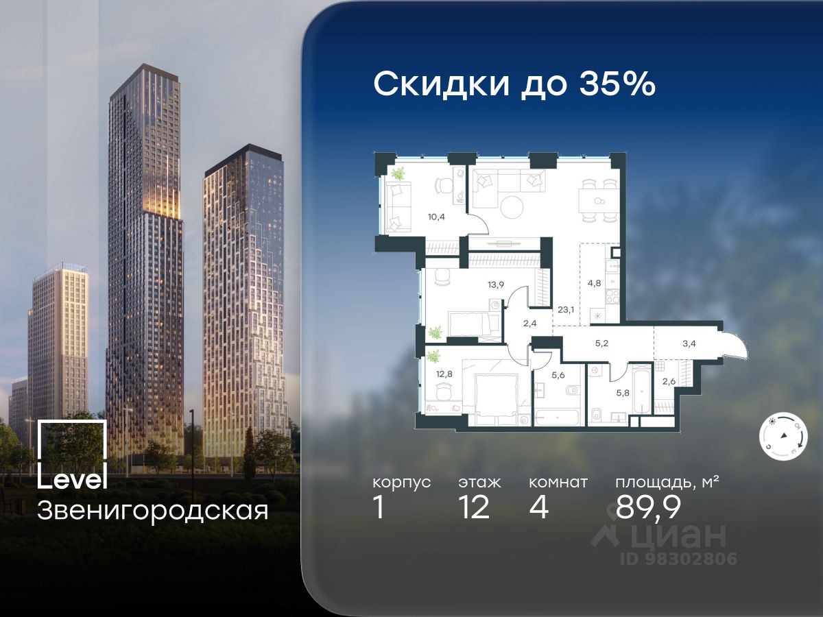 В жилом квартале продаётся 4-комнатная квартира площадью 89.90 кв.м white box. Квартира расположена на 12 этаже 48 этажного корпуса 1 в жилом комплексе комфорт класса Level Звенигородская (компания Level Group/Левел групп).