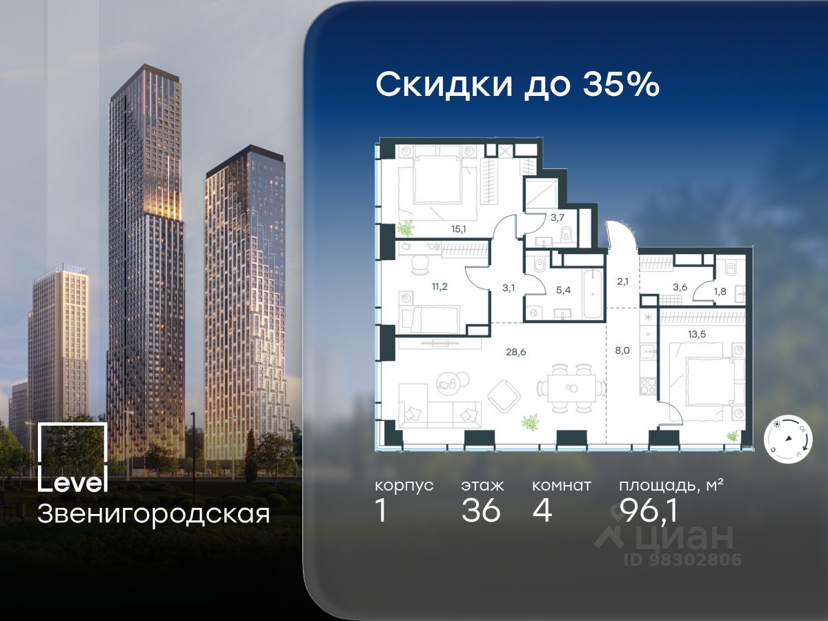 В жилом квартале продаётся 4-комнатная квартира площадью 96.10 кв.м white box. Квартира расположена на 36 этаже 48 этажного корпуса 1 в жилом комплексе комфорт класса Level Звенигородская (компания Level Group/Левел групп).