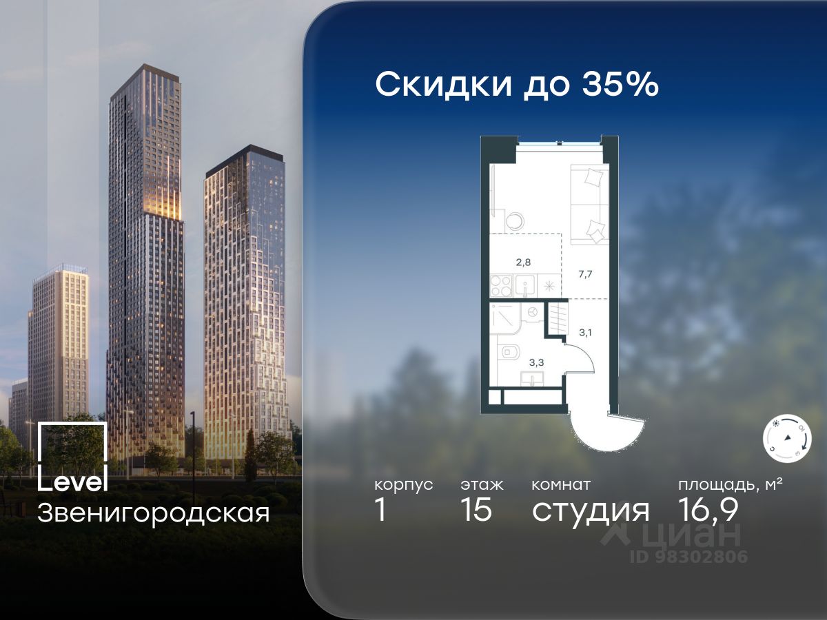 В жилом квартале продаётся студия площадью 16.90 кв.м white box. Квартира расположена на 15 этаже 48 этажного корпуса 1 в жилом комплексе комфорт класса Level Звенигородская (компания Level Group/Левел групп).