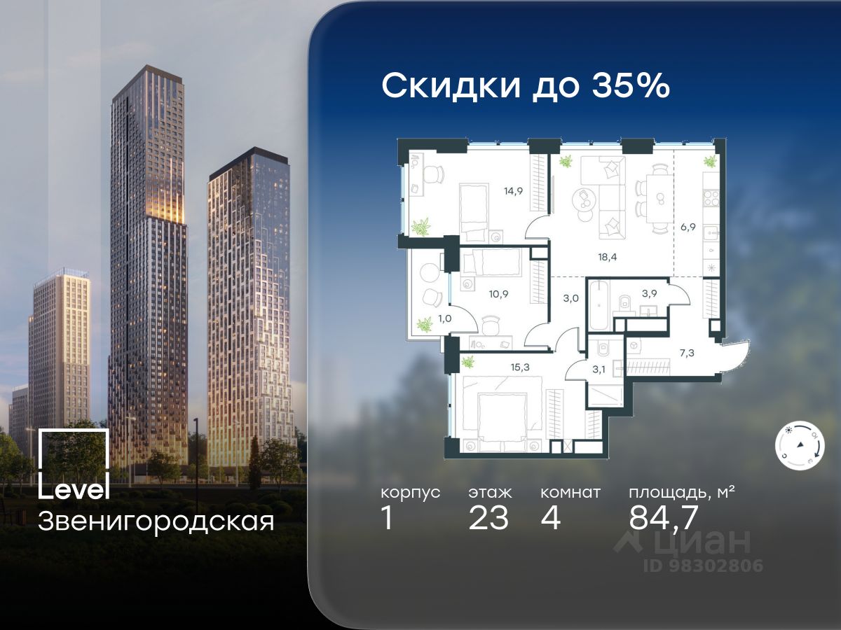 В жилом квартале продаётся 4-комнатная квартира площадью 84.70 кв.м white box. Квартира расположена на 23 этаже 48 этажного корпуса 1 в жилом комплексе комфорт класса Level Звенигородская (компания Level Group/Левел групп).
