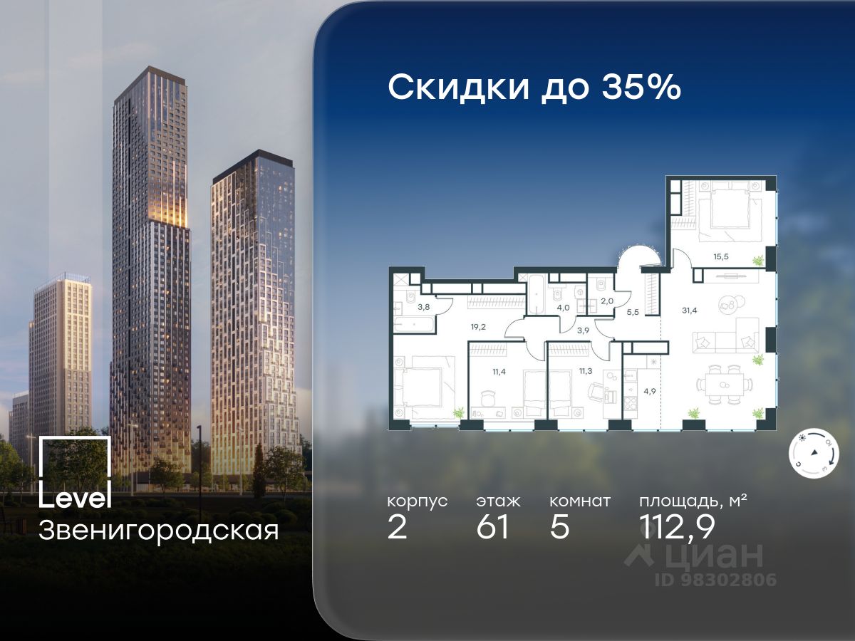 В жилом квартале продаётся многокомнатная квартира площадью 112.90 кв.м без отделки. Квартира расположена на 61 этаже 64 этажного корпуса 2 в жилом комплексе комфорт класса Level Звенигородская (компания Level Group/Левел групп).
