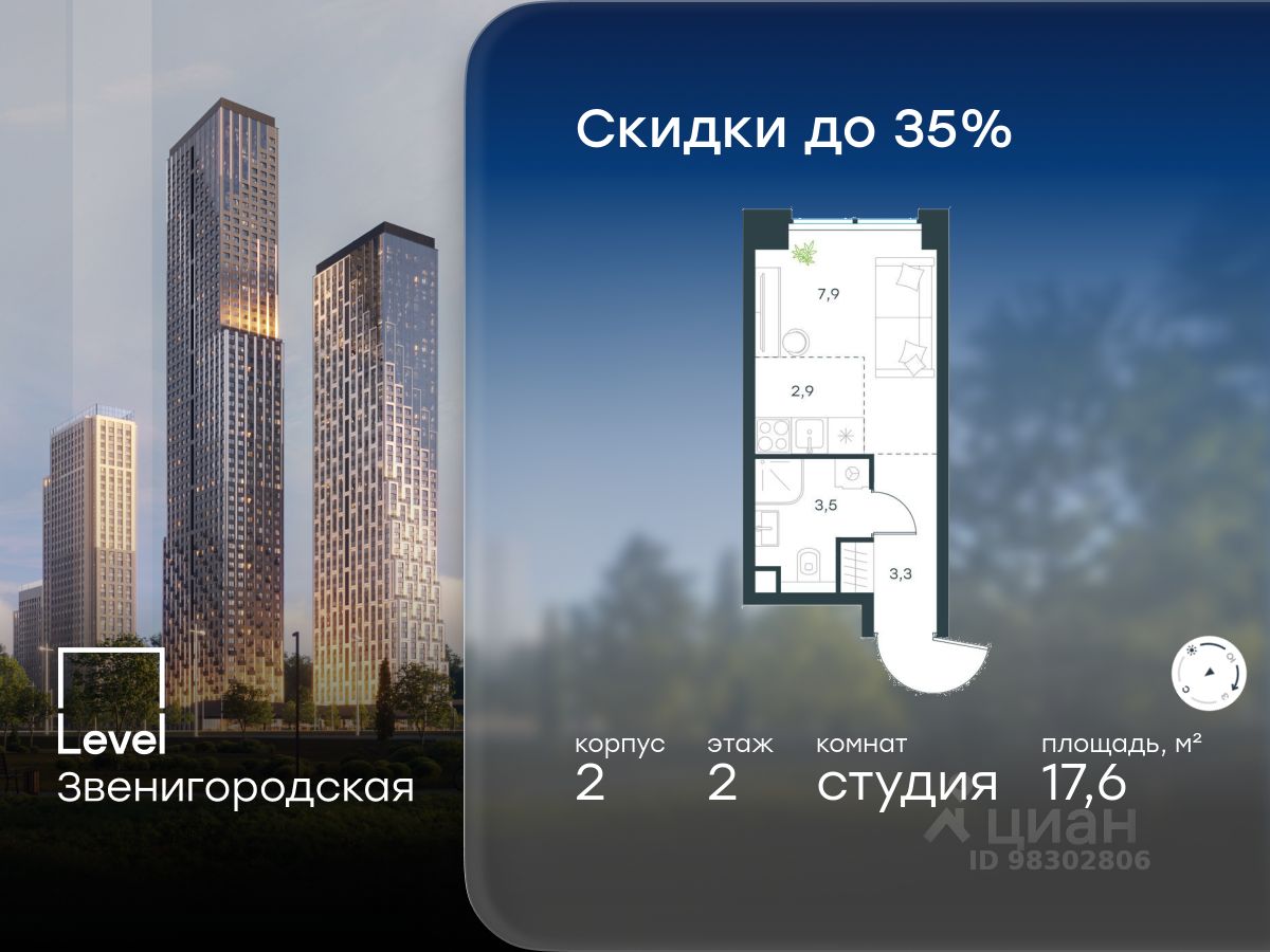 В жилом квартале продаётся студия площадью 17.60 кв.м без отделки. Квартира расположена на 2 этаже 64 этажного корпуса 2 в жилом комплексе комфорт класса Level Звенигородская (компания Level Group/Левел групп).