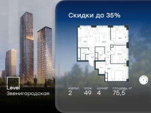 В жилом квартале продаётся 4-комнатная квартира площадью 75.50 кв.м без отделки. Квартира расположена на 49 этаже 64 этажного корпуса 2 в жилом комплексе комфорт класса Level Звенигородская (компания Level Group/Левел групп).