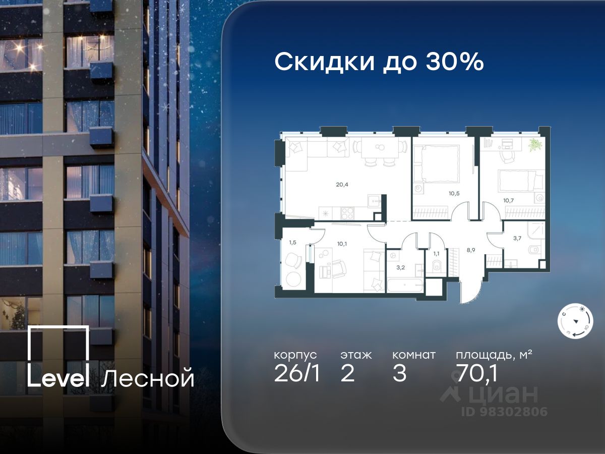 В районе, утопающем в густой зелени лесов, многочисленных парков и скверов, продаётся 3-комнатная квартира площадью 70.10 кв.м с отделкой white box. Квартира расположена на 2 этаже в жилом комплексе комфорт-класса Level Лесной (компания Level Group/Левел групп).