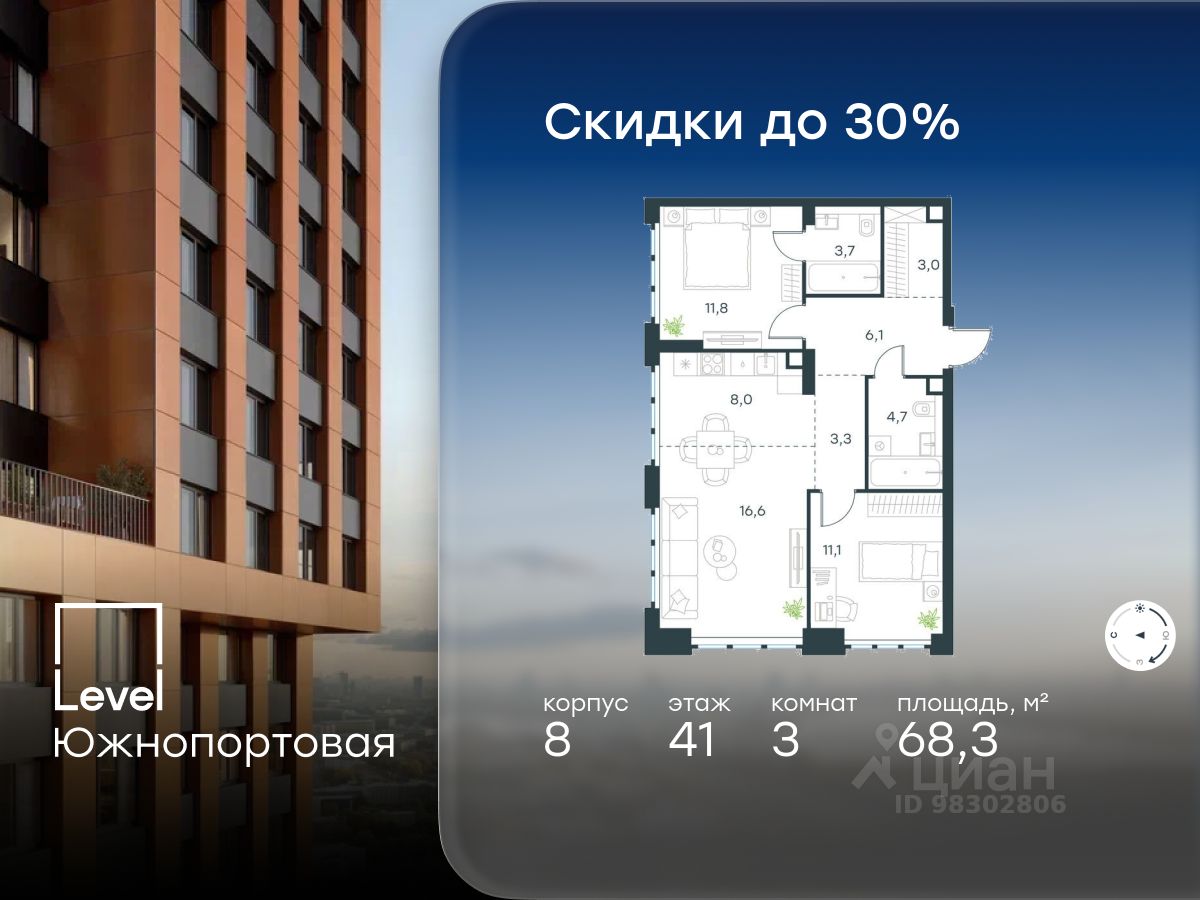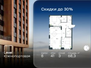 В северной части района Печатники продается 3-комнатная квартира площадью 68.30 кв.м без отделки. Квартира расположена на 41 этаже 49-этажного корпуса 8 в жилом комплексе комфорт-класса Level Южнопортовая (компания Level Group/Левел групп).