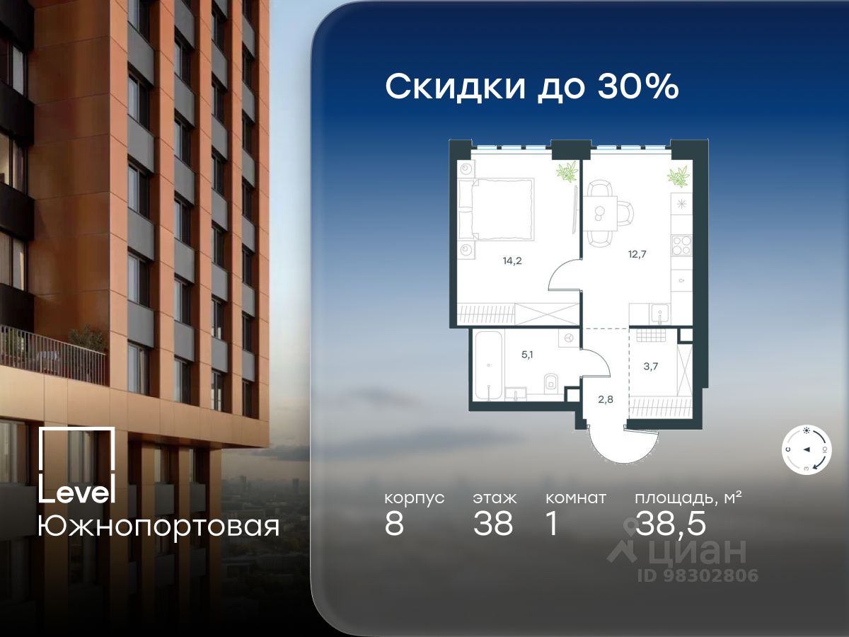 В северной части района Печатники продается 1-комнатная квартира площадью 38.50 кв.м без отделки. Квартира расположена на 38 этаже 49-этажного корпуса 8 в жилом комплексе комфорт-класса Level Южнопортовая (компания Level Group/Левел групп).